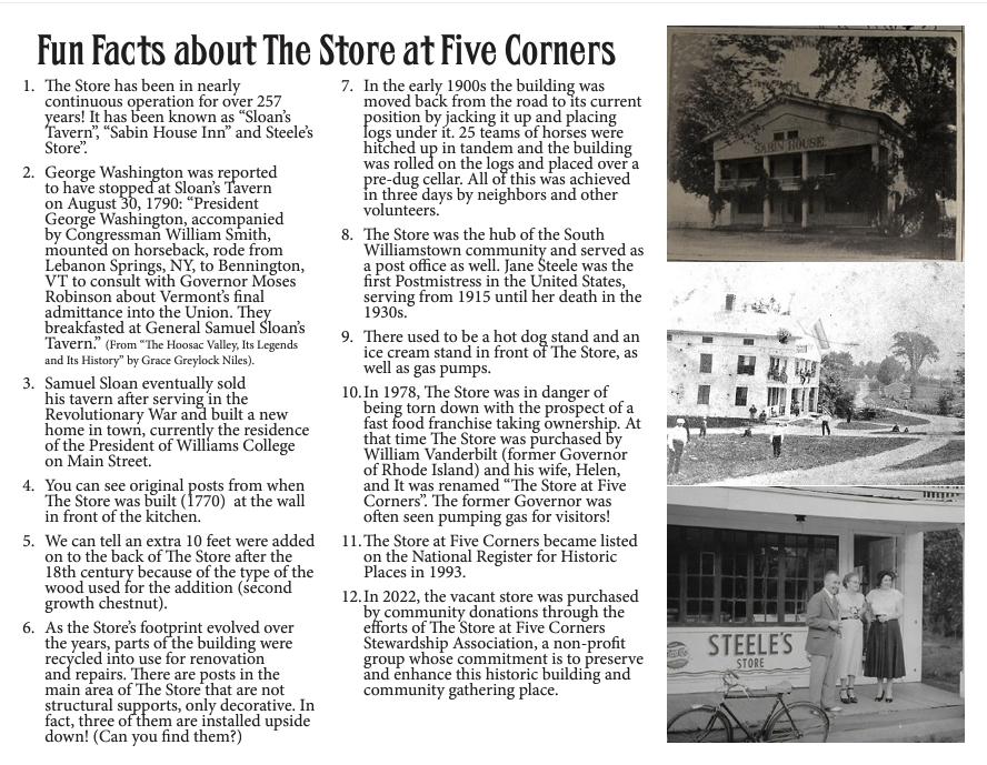 Elder residents still refer to this historic site as “Steele’s Comers.” Perhaps it is not too unrealistic that the South Williamstown Community Association would like to see some of this old-fashioned sentiment returned to a permanent re-opening of the Store at Five Corners–regretfully closed for the first time in 239 years. Until its closing in 2011 it was considered one of the oldest continuously operating businesses in the United States.